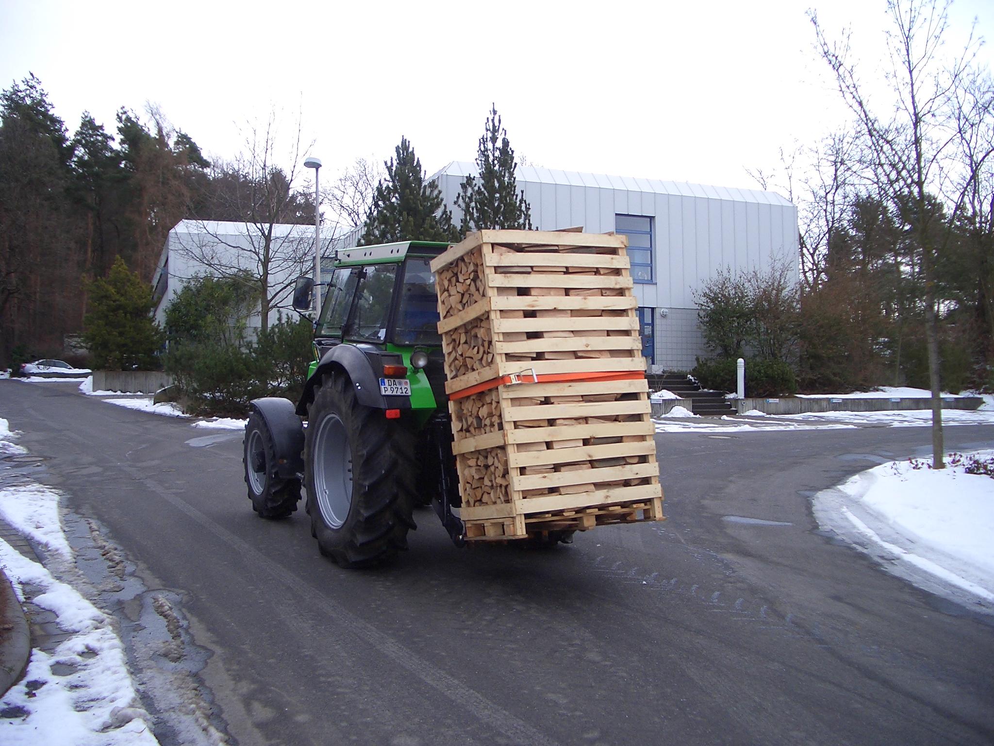 | Holzkiste beim Aufladen | hier können sie sich unsere kiste (2 raummeter) ansehen (sie wird gerade an einer Heckladevorrichtung eines Schleppers befestigt wird) | 31.1.2004 | ||
